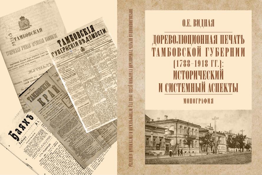 Видная, О. Е. Дореволюционная печать Тамбовской губернии (1788–1918 гг.): исторический и системный аспекты: монография / О. Е. Видная; Тамбовский государственный университет имени Г. Р. Державина. — Тамбов: Издательский дом «Державинский», 2024 — 1 файл (4,19 Мб). — Загл. с тит. экрана. — Режим доступа: для авторизир. пользователей. — <URL:https://elibrary.tsutmb.ru/dl/docs/elib2128.pdf>.