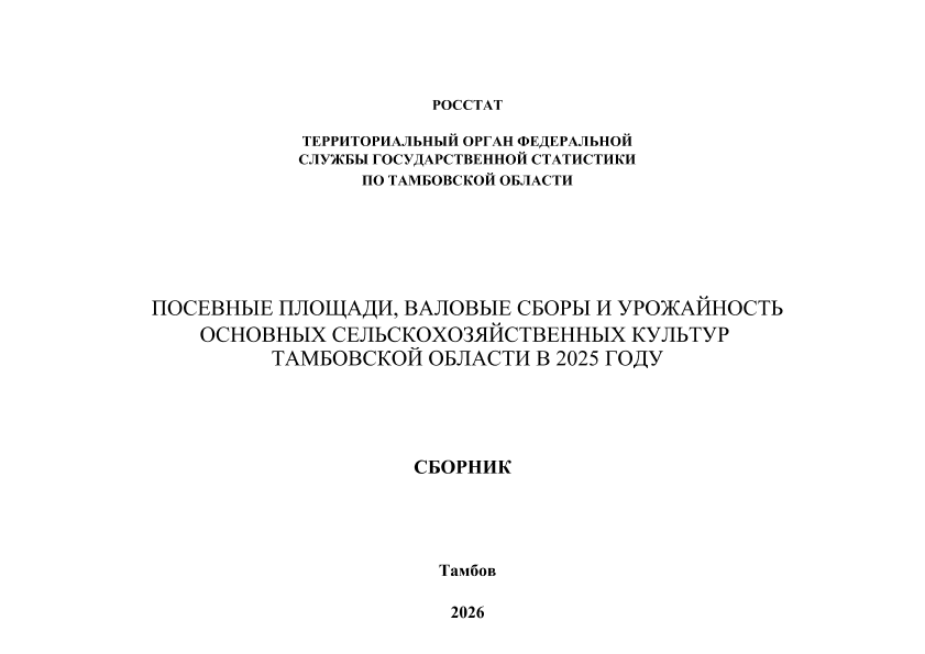 Посевные площади, валовые сборы и урожайность основных сельскохозяйственных культур в 2025 году: сборник / РОССТАТ, Территориальный орган Федеральной службы государственной статистической власти по Тамбовской области; С. Ю. Яковлева, Г. Г. Спиридонова. — Тамбов: [Издательский центр Тамбовстата], 2026 — 1 файл (3,12 Мб). — Загл. с тит. экрана. — Режим доступа: для авторизир. пользователей. — <URL:https://elibrary.tsutmb.ru/dl/docs/elib2130.pdf>.