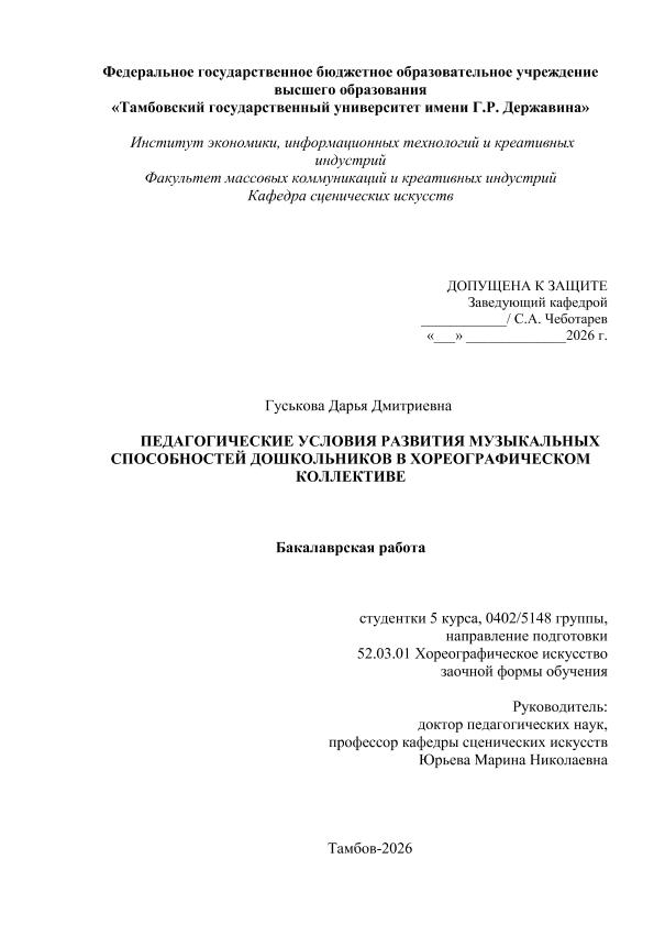 ГУСЬКОВА, ДАРЬЯ ДМИТРИЕВНА. ПЕДАГОГИЧЕСКИЕ УСЛОВИЯ РАЗВИТИЯ МУЗЫКАЛЬНЫХ СПОСОБНОСТЕЙ ДОШКОЛЬНИКОВ В ХОРЕОГРАФИЧЕСКОМ КОЛЛЕКТИВЕ [Электронный ресурс]: бакалаврская работа: 52.03.01 Хореографическое искусство: Заочная форма обучения / Д. А. ГУСЬКОВА; ТГУ им. Г. Р. Державина ; науч. рук. д. пед. н., профессор, М. Н. Юрьева. — Электрон. текстовые дан. (1 файл). — Тамбов, 2026. — Загл. с титул. экрана. — <URL:https://elibrary.tsutmb.ru/dl/docs/vkr19324.pdf>.