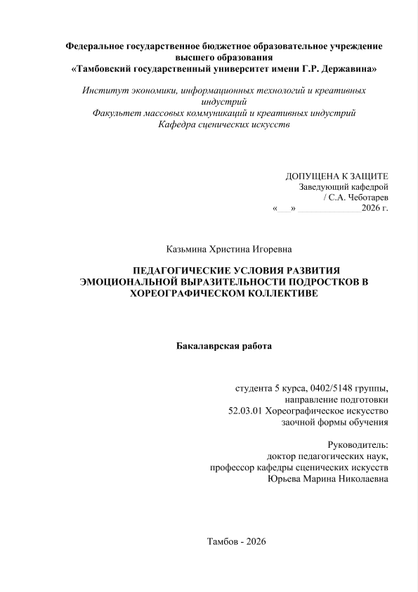 ХОРЕОГРАФИЧЕСКОМ КОЛЛЕКТИВЕ [Электронный ресурс]: бакалаврская работа: 52.03.01 Хореографическое искусство: Заочная форма обучения / Х. И. КАЗЬМИНА; ТГУ им. Г. Р. Державина ; науч. рук. д. пед. н., профессор, М. Н. Юрьева. — Электрон. текстовые дан. (1 файл). — Тамбов, 2026. — Загл. с титул. экрана. — <URL:https://elibrary.tsutmb.ru/dl/docs/vkr19325.pdf>.