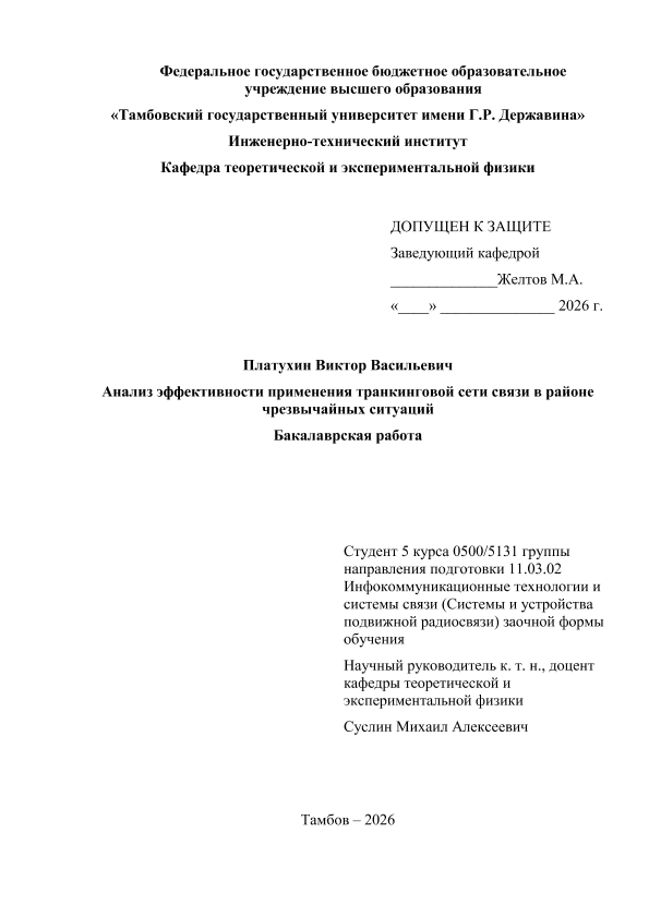 ПЛАТУХИН, ВИКТОР ВАСИЛЬЕВИЧ. АНАЛИЗ ЭФФЕКТИВНОСТИ ПРИМЕНЕНИЯ ТРАНКИНГОВОЙ СЕТИ СВЯЗИ В РАЙОНЕ ЧРЕЗВЫЧАЙНЫХ СИТУАЦИЙ [Электронный ресурс]: бакалаврская работа: 11.03.02 Инфокоммуникационные технологии и системы связи: Заочная форма обучения / В. В. ПЛАТУХИН; ТГУ им. Г. Р. Державина ; науч. рук. к. т. н., доцент, М. А. Суслин. — Электрон. текстовые дан. (1 файл). — Тамбов, 2026. — Загл. с титул. экрана. — <URL:https://elibrary.tsutmb.ru/dl/docs/vkr19156.pdf>.