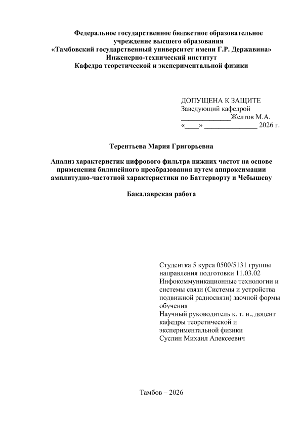 ТЕРЕНТЬЕВА, МАРИЯ ГРИГОРЬЕВНА. АНАЛИЗ ХАРАКТЕРИСТИК ЦИФРОВОГО ФИЛЬТРА НИЖНИХ ЧАСТОТ НА ОСНОВЕ ПРИМЕНЕНИЯ БИЛИНЕЙНОГО ПРЕОБРАЗОВАНИЯ ПУТЕМ АППРОКСИМАЦИИ АМПЛИТУДНО-ЧАСТОТНОЙ ХАРАКТЕРИСТИКИ ПО БАТТЕРВОРТУ И ЧЕБЫШЕВУ [Электронный ресурс]: бакалаврская работа: 11.03.02 Инфокоммуникационные технологии и системы связи: Заочная форма обучения / М. Г. ТЕРЕНТЬЕВА; ТГУ им. Г. Р. Державина ; науч. рук. к. т. н., доцент, М. А. Суслин. — Электрон. текстовые дан. (1 файл). — Тамбов, 2026. — Загл. с титул. экрана. — <URL:https://elibrary.tsutmb.ru/dl/docs/vkr19157.pdf>.