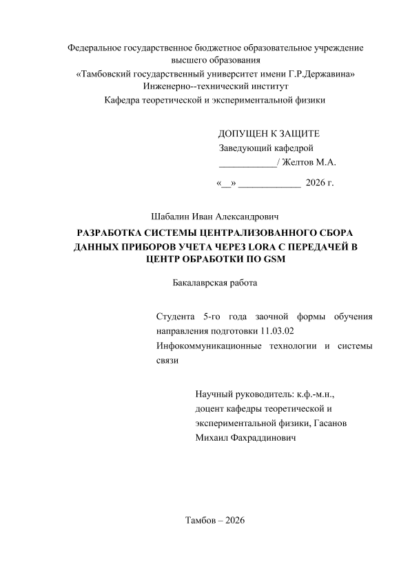 ШАБАЛИН, ИВАН АЛЕКСАНДРОВИЧ. РАЗРАБОТКА СИСТЕМЫ ЦЕНТРАЛИЗОВАННОГО СБОРА ДАННЫХ ПРИБОРОВ УЧЕТА ЧЕРЕЗ LORA С ПЕРЕДАЧЕЙ В ЦЕНТР ОБРАБОТКИ ПО GSM [Электронный ресурс]: бакалаврская работа: 11.03.02 Инфокоммуникационные технологии и системы связи: Заочная форма обучения / И. А. ШАБАЛИН; ТГУ им. Г. Р. Державина ; науч. рук. к. ф.-м. н., старший преподаватель, М. Ф. Гасанов. — Электрон. текстовые дан. (1 файл). — Тамбов, 2026. — Загл. с титул. экрана. — <URL:https://elibrary.tsutmb.ru/dl/docs/vkr19159.pdf>.