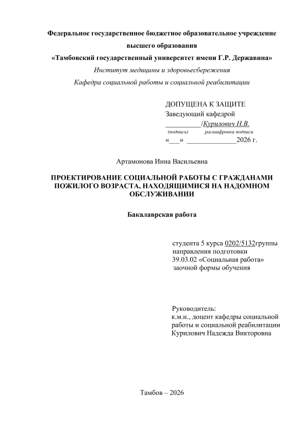 АРТАМОНОВА, ИННА ВАСИЛЬЕВНА. ПРОЕКТИРОВАНИЕ СОЦИАЛЬНОЙ РАБОТЫ С ГРАЖДАНАМИ ПОЖИЛОГО ВОЗРАСТА, НАХОДЯЩИМИСЯ НА НАДОМНОМ ОБСЛУЖИВАНИИ [Электронный ресурс]: бакалаврская работа: 39.03.02 Социальная работа: Заочная форма обучения / И. В. АРТАМОНОВА; ТГУ им. Г. Р. Державина ; науч. рук. д. пед. н., профессор, Н. В. Курилович. — Электрон. текстовые дан. (1 файл). — Тамбов, 2026. — Загл. с титул. экрана. — <URL:https://elibrary.tsutmb.ru/dl/docs/vkr19160.pdf>.