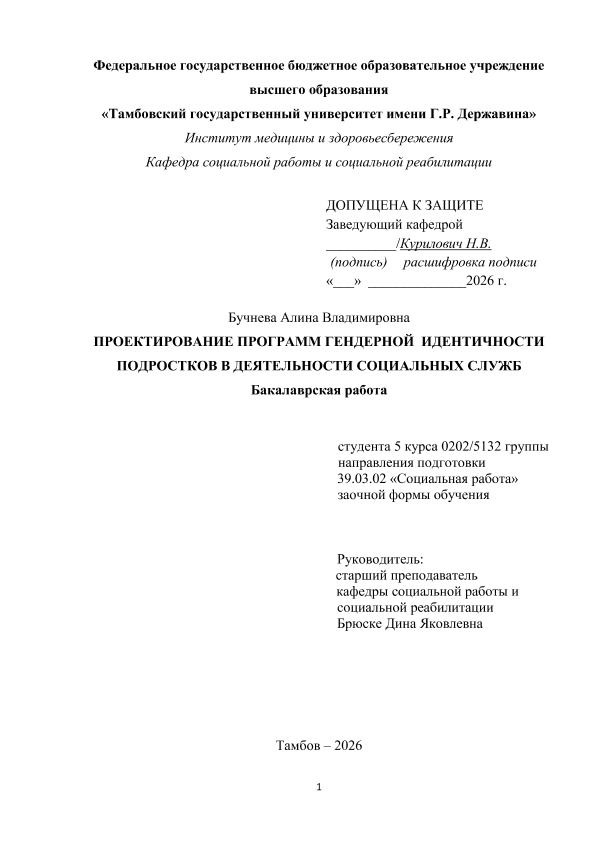 БУЧНЕВА, АЛИНА ВЛАДИМИРОВНА. ПРОЕКТИРОВАНИЕ ПРОГРАММ ГЕНДЕРНОЙ ИДЕНТИЧНОСТИ ПОДРОСТКОВ В ДЕЯТЕЛЬНОСТИ СОЦИАЛЬНЫХ СЛУЖБ [Электронный ресурс]: бакалаврская работа: 39.03.02 Социальная работа: Заочная форма обучения / А. В. БУЧНЕВА; ТГУ им. Г. Р. Державина ; науч. рук. к. пед. н., доцент, Д. Я. Брюске. — Электрон. текстовые дан. (1 файл). — Тамбов, 2026. — Загл. с титул. экрана. — <URL:https://elibrary.tsutmb.ru/dl/docs/vkr19161.pdf>.