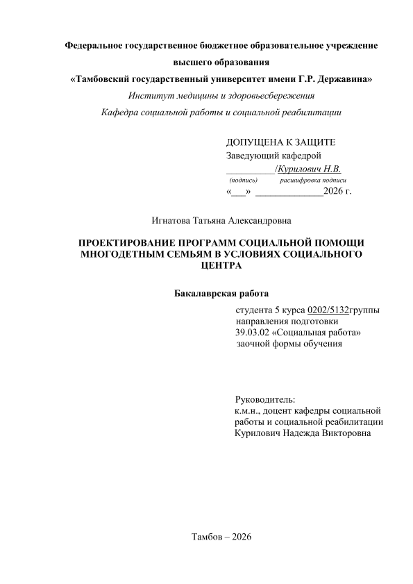 ИГНАТОВА, ТАТЬЯНА АЛЕКСАНДРОВНА. ПРОЕКТИРОВАНИЕ ПРОГРАММ СОЦИАЛЬНОЙ ПОМОЩИ МНОГОДЕТНЫМ СЕМЬЯМ В УСЛОВИЯХ СОЦИАЛЬНОГО ЦЕНТРА [Электронный ресурс]: бакалаврская работа: 39.03.02 Социальная работа: Заочная форма обучения / Т. А. ИГНАТОВА; ТГУ им. Г. Р. Державина ; науч. рук. д. пед. н., профессор, Н. В. Курилович. — Электрон. текстовые дан. (1 файл). — Тамбов, 2026. — Загл. с титул. экрана. — <URL:https://elibrary.tsutmb.ru/dl/docs/vkr19162.pdf>.