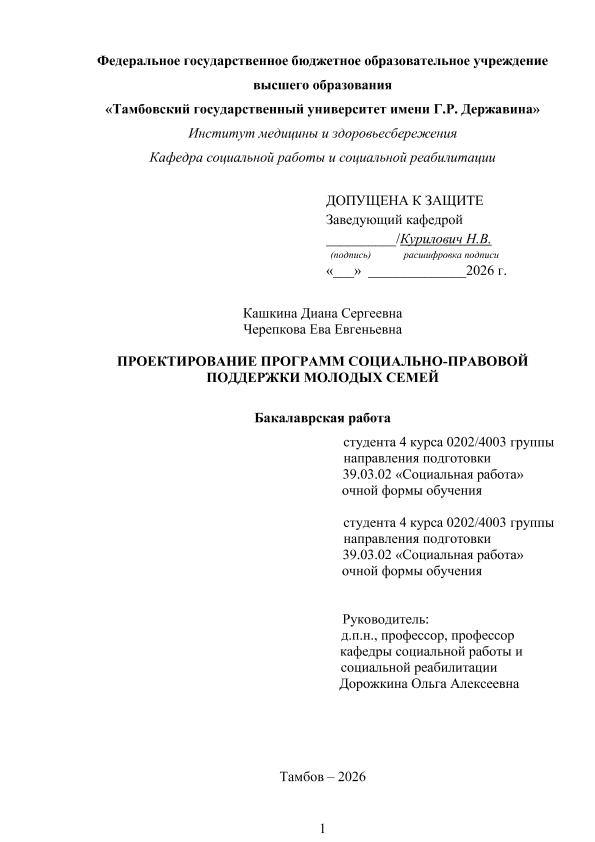 КАШКИНА, ДИАНА СЕРГЕЕВНА. ПРОЕКТИРОВАНИЕ ПРОГРАММ СОЦИАЛЬНО-ПРАВОВОЙ ПОДДЕРЖКИ МОЛОДЫХ СЕМЕЙ [Электронный ресурс]: бакалаврская работа: 39.03.02 Социальная работа: Заочная форма обучения / Д. С. КАШКИНА; ТГУ им. Г. Р. Державина ; науч. рук. д. пед. н., профессор, О. А. Дорожкина. — Электрон. текстовые дан. (1 файл). — Тамбов, 2026. — Загл. с титул. экрана. — <URL:https://elibrary.tsutmb.ru/dl/docs/vkr19163.pdf>.