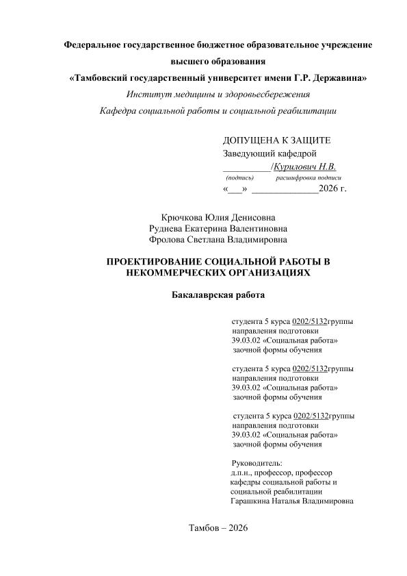 КОВА, ЮЛИЯ ДЕНИСОВНА. ПРОЕКТИРОВАНИЕ СОЦИАЛЬНОЙ РАБОТЫ В НЕКОММЕРЧЕСКИХ ОРГАНИЗАЦИЯХ [Электронный ресурс]: бакалаврская работа: 39.03.02 Социальная работа: Заочная форма обучения / Ю. Д. КОВА; ТГУ им. Г. Р. Державина ; науч. рук. д. пед. н., профессор, Н. В. Гарашкина. — Электрон. текстовые дан. (1 файл). — Тамбов, 2026. — Загл. с титул. экрана. — <URL:https://elibrary.tsutmb.ru/dl/docs/vkr19164.pdf>.