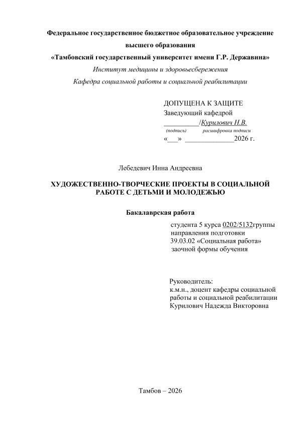 ЛЕБЕДЕВИЧ, ИННА АНДРЕЕВНА. ХУДОЖЕСТВЕННО-ТВОРЧЕСКИЕ ПРОЕКТЫ В СОЦИАЛЬНОЙ РАБОТЕ С ДЕТЬМИ И МОЛОДЕЖЬЮ [Электронный ресурс]: бакалаврская работа: 39.03.02 Социальная работа: Заочная форма обучения / И. А. ЛЕБЕДЕВИЧ; ТГУ им. Г. Р. Державина ; науч. рук. д. пед. н., профессор, Н. В. Курилович. — Электрон. текстовые дан. (1 файл). — Тамбов, 2026. — Загл. с титул. экрана. — <URL:https://elibrary.tsutmb.ru/dl/docs/vkr19165.pdf>.