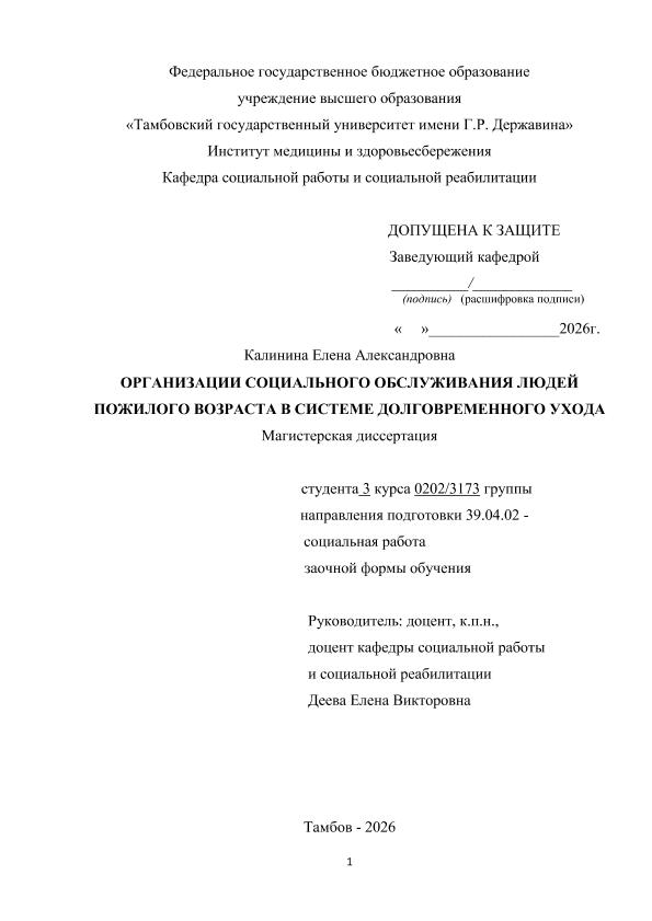 КАЛИНИНА, ЕЛЕНА АЛЕКСАНДРОВНА. ОРГАНИЗАЦИИ СОЦИАЛЬНОГО ОБСЛУЖИВАНИЯ ЛЮДЕЙ ПОЖИЛОГО ВОЗРАСТА В СИСТЕМЕ ДОЛГОВРЕМЕННОГО УХОДА [Электронный ресурс]: магистерская диссертация: 39.04.02 Социальная работа: Заочная форма обучения / Е. А. КАЛИНИНА; ТГУ им. Г. Р. Державина ; науч. рук. к. пед. н., доцент, Е. В. Деева. — Электрон. текстовые дан. (1 файл). — Тамбов, 2026. — Загл. с титул. экрана. — <URL:https://elibrary.tsutmb.ru/dl/docs/vkr19171.pdf>.