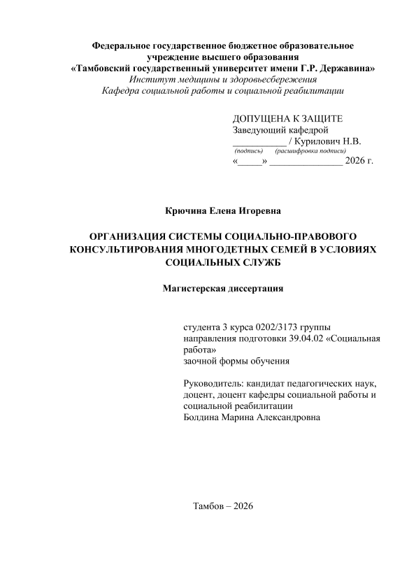 КРЮЧИНА, ЕЛЕНА ИГОРЕВНА. ОРГАНИЗАЦИЯ СИСТЕМЫ СОЦИАЛЬНО-ПРАВОВОГО КОНСУЛЬТИРОВАНИЯ МНОГОДЕТНЫХ СЕМЕЙ В УСЛОВИЯХ СОЦИАЛЬНЫХ СЛУЖБ [Электронный ресурс]: магистерская диссертация: 39.04.02 Социальная работа: Заочная форма обучения / Е. И. КРЮЧИНА; ТГУ им. Г. Р. Державина ; науч. рук. к. пед. н., доцент, М. А. Болдина. — Электрон. текстовые дан. (1 файл). — Тамбов, 2026. — Загл. с титул. экрана. — <URL:https://elibrary.tsutmb.ru/dl/docs/vkr19172.pdf>.