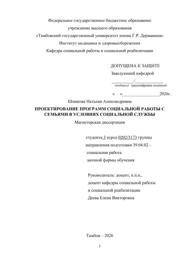 ШМАКОВА, НАТАЛИЯ АЛЕКСАНДРОВНА. ПРОЕКТИРОВАНИЕ ПРОГРАММ СОЦИАЛЬНОЙ РАБОТЫ С СЕМЬЯМИ В УСЛОВИЯХ СОЦИАЛЬНОЙ СЛУЖБЫ [Электронный ресурс]: магистерская диссертация: 39.04.02 Социальная работа: Заочная форма обучения / Н. А. ШМАКОВА; ТГУ им. Г. Р. Державина ; науч. рук. к. пед. н., доцент, Е. В. Деева. — Электрон. текстовые дан. (1 файл). — Тамбов, 2026. — Загл. с титул. экрана. — <URL:https://elibrary.tsutmb.ru/dl/docs/vkr19173.pdf>.