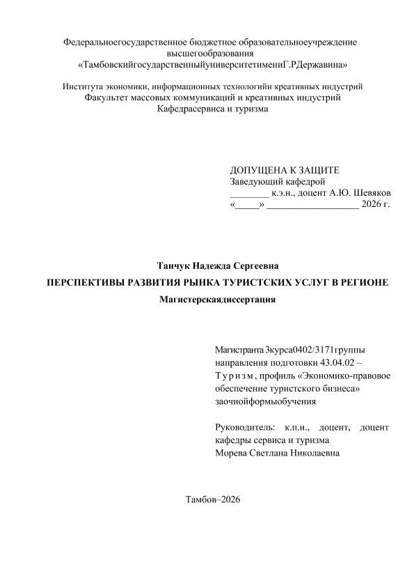 ТАНЧУК, НАДЕЖДА СЕРГЕЕВНА. ПЕРСПЕКТИВЫ РАЗВИТИЯ РЫНКА ТУРИСТСКИХ УСЛУГ В РЕГИОНЕ [Электронный ресурс]: магистерская диссертация: 43.04.02 Туризм: Экономико-правовое обеспечение туристского бизнеса: Заочная форма обучения / Н. С. ТАНЧУК; ТГУ им. Г. Р. Державина ; науч. рук. к. пед. н., доцент, С. Н. Морева. — Электрон. текстовые дан. (1 файл). — Тамбов, 2026. — Загл. с титул. экрана. — <URL:https://elibrary.tsutmb.ru/dl/docs/vkr19174.pdf>.