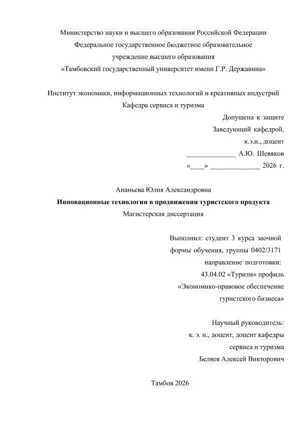 АНАНЬЕВА, ЮЛИЯ АЛЕКСАНДРОВНА. ИННОВАЦИОННЫЕ ТЕХНОЛОГИИ В ПРОДВИЖЕНИИ ТУРИСТСКОГО ПРОДУКТА [Электронный ресурс]: магистерская диссертация: 43.04.02 Туризм: Экономико-правовое обеспечение туристского бизнеса: Заочная форма обучения / Ю. А. АНАНЬЕВА; ТГУ им. Г. Р. Державина ; науч. рук. к. э. н., доцент, А. В. Беляев. — Электрон. текстовые дан. (1 файл). — Тамбов, 2026. — Загл. с титул. экрана. — <URL:https://elibrary.tsutmb.ru/dl/docs/vkr19175.pdf>.