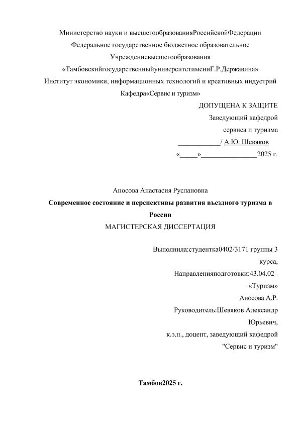 АНОСОВА, АНАСТАСИЯ РУСЛАНОВНА. СОВРЕМЕННОЕ СОСТОЯНИЕ И ПЕРСПЕКТИВЫ РАЗВИТИЯ ВЪЕЗДНОГО ТУРИЗМА В РОССИИ [Электронный ресурс]: магистерская диссертация: 43.04.02 Туризм: Экономико-правовое обеспечение туристского бизнеса: Заочная форма обучения / А. Р. АНОСОВА; ТГУ им. Г. Р. Державина ; науч. рук. к. э. н., доцент, А. Ю. Шевяков. — Электрон. текстовые дан. (1 файл). — Тамбов, 2026. — Загл. с титул. экрана. — <URL:https://elibrary.tsutmb.ru/dl/docs/vkr19176.pdf>.
