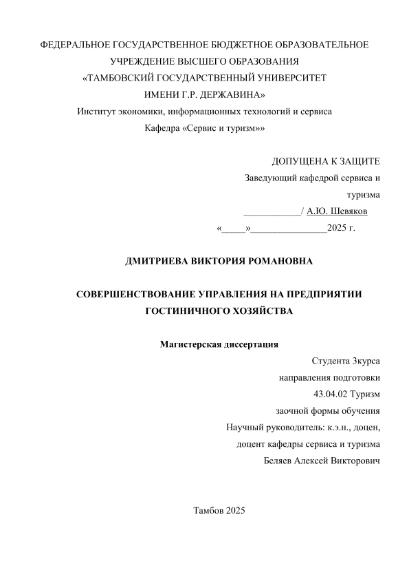 ДМИТРИЕВА, ВИКТОРИЯ РОМАНОВНА. СОВЕРШЕНСТВОВАНИЕ УПРАВЛЕНИЯ НА ПРЕДПРИЯТИИ ГОСТИНИЧНОГО ХОЗЯЙСТВА [Электронный ресурс]: магистерская диссертация: 43.04.02 Туризм: Экономико-правовое обеспечение туристского бизнеса: Заочная форма обучения / В. Р. ДМИТРИЕВА; ТГУ им. Г. Р. Державина ; науч. рук. к. э. н., доцент, А. В. Беляев. — Электрон. текстовые дан. (1 файл). — Тамбов, 2026. — Загл. с титул. экрана. — <URL:https://elibrary.tsutmb.ru/dl/docs/vkr19177.pdf>.