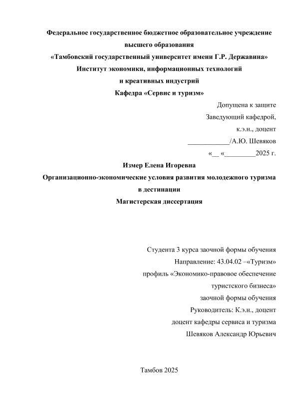 ИЗМЕР, ЕЛЕНА ИГОРЕВНА. ОРГАНИЗАЦИОННО-ЭКОНОМИЧЕСКИЕ УСЛОВИЯ РАЗВИТИЯ МОЛОДЕЖНОГО ТУРИЗМА В ДЕСТИНАЦИИ [Электронный ресурс]: магистерская диссертация: 43.04.02 Туризм: Экономико-правовое обеспечение туристского бизнеса: Заочная форма обучения / Е. И. ИЗМЕР; ТГУ им. Г. Р. Державина ; науч. рук. к. э. н., доцент, А. Ю. ШЕВЯКОВ. — Электрон. текстовые дан. (1 файл). — Тамбов, 2026. — Загл. с титул. экрана. — <URL:https://elibrary.tsutmb.ru/dl/docs/vkr19178.pdf>.