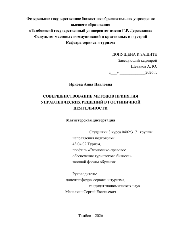 ИРКОВА, АННА ПАВЛОВНА. СОВЕРШЕНСТВОВАНИЕ МЕТОДОВ ПРИНЯТИЯ УПРАВЛЕНЧЕСКИХ РЕШЕНИЙ В ГОСТИНИЧНОЙ ДЕЯТЕЛЬНОСТИ [Электронный ресурс]: магистерская диссертация: 43.04.02 Туризм: Экономико-правовое обеспечение туристского бизнеса: Заочная форма обучения / А. П. ИРКОВА; ТГУ им. Г. Р. Державина ; науч. рук. к. г. н., доцент, С. Е. Мачалкин. — Электрон. текстовые дан. (1 файл). — Тамбов, 2026. — Загл. с титул. экрана. — <URL:https://elibrary.tsutmb.ru/dl/docs/vkr19179.pdf>.