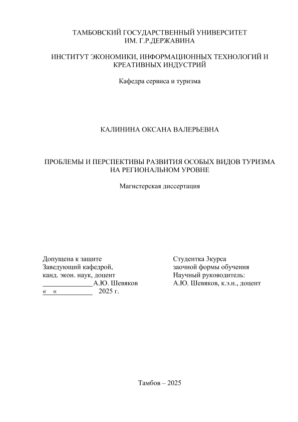 КАЛИНИНА, ОКСАНА ВАЛЕРЬЕВНА. ПРОБЛЕМЫ И ПЕРСПЕКТИВЫ РАЗВИТИЯ ОСОБЫХ ВИДОВ ТУРИЗМА [Электронный ресурс]: магистерская диссертация: 43.04.02 Туризм: Экономико-правовое обеспечение туристского бизнеса: Заочная форма обучения / О. В. КАЛИНИНА; ТГУ им. Г. Р. Державина ; науч. рук. к. э. н., доцент, А. Ю. Шевяков. — Электрон. текстовые дан. (1 файл). — Тамбов, 2026. — Загл. с титул. экрана. — <URL:https://elibrary.tsutmb.ru/dl/docs/vkr19180.pdf>.