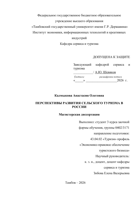 КАЛМЫКОВА, АНАСТАСИЯ ОЛЕГОВНА. ПЕРСПЕКТИВЫ РАЗВИТИЯ СЕЛЬСКОГО ТУРИЗМА В РОССИИ [Электронный ресурс]: магистерская диссертация: 43.04.02 Туризм: Экономико-правовое обеспечение туристского бизнеса: Заочная форма обучения / А. О. КАЛМЫКОВА; ТГУ им. Г. Р. Державина ; науч. рук. к. э. н., доцент, Е. В. Зобова. — Электрон. текстовые дан. (1 файл). — Тамбов, 2026. — Загл. с титул. экрана. — <URL:https://elibrary.tsutmb.ru/dl/docs/vkr19181.pdf>.