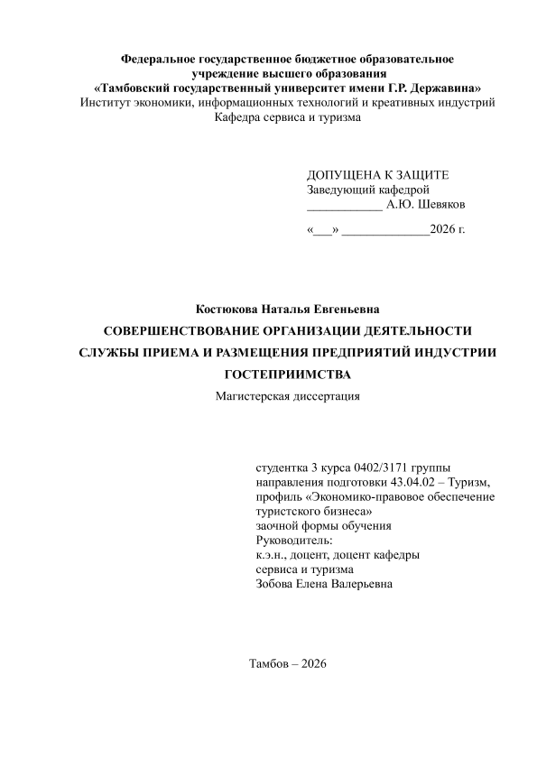 КОСТЮКОВА, НАТАЛЬЯ ЕВГЕНЬЕВНА. СОВЕРШЕНСТВОВАНИЕ ОРГАНИЗАЦИИ ДЕЯТЕЛЬНОСТИ СЛУЖБЫ ПРИЕМА И РАЗМЕЩЕНИЯ ПРЕДПРИЯТИЙ ИНДУСТРИИ ГОСТЕПРИИМСТВА [Электронный ресурс]: магистерская диссертация: 43.04.02 Туризм: Экономико-правовое обеспечение туристского бизнеса: Заочная форма обучения / Н. Е. КОСТЮКОВА; ТГУ им. Г. Р. Державина ; науч. рук. к. э. н., доцент, Е. В. Зобова. — Электрон. текстовые дан. (1 файл). — Тамбов, 2026. — Загл. с титул. экрана. — <URL:https://elibrary.tsutmb.ru/dl/docs/vkr19182.pdf>.