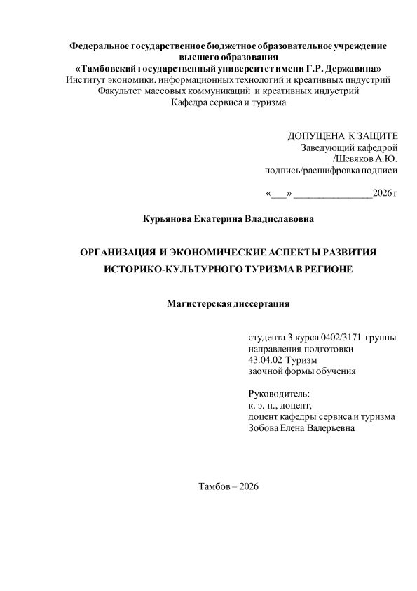 КУРЬЯНОВА, ЕКАТЕРИНА ВЛАДИСЛАВОВНА. ОРГАНИЗАЦИЯ И ЭКОНОМИЧЕСКИЕ АСПЕКТЫ РАЗВИТИЯ ИСТОРИКО-КУЛЬТУРНОГО ТУРИЗМА В РЕГИОНЕ [Электронный ресурс]: магистерская диссертация: 43.04.02 Туризм: Экономико-правовое обеспечение туристского бизнеса: Заочная форма обучения / Е. В. КУРЬЯНОВА; ТГУ им. Г. Р. Державина ; науч. рук. к. э. н., доцент, Е. В. Зобова. — Электрон. текстовые дан. (1 файл). — Тамбов, 2026. — Загл. с титул. экрана. — <URL:https://elibrary.tsutmb.ru/dl/docs/vkr19184.pdf>.