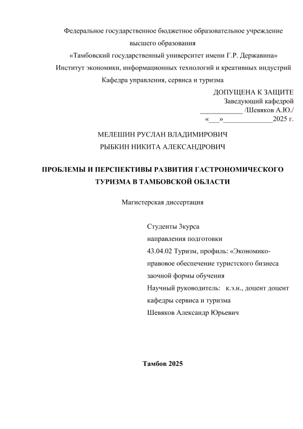 МЕЛЕШИН, РУСЛАН ВЛАДИМИРОВИЧ. ПРОБЛЕМЫ И ПЕРСПЕКТИВЫ РАЗВИТИЯ ГАСТРОНОМИЧЕСКОГО ТУРИЗМА В ТАМБОВСКОЙ ОБЛАСТИ [Электронный ресурс]: магистерская диссертация: 43.04.02 Туризм: Экономико-правовое обеспечение туристского бизнеса: Заочная форма обучения / Р. В. МЕЛЕШИН; ТГУ им. Г. Р. Державина ; науч. рук. к. э. н., доцент, А. Ю. Шевяков. — Электрон. текстовые дан. (1 файл). — Тамбов, 2026. — Загл. с титул. экрана. — <URL:https://elibrary.tsutmb.ru/dl/docs/vkr19185.pdf>.