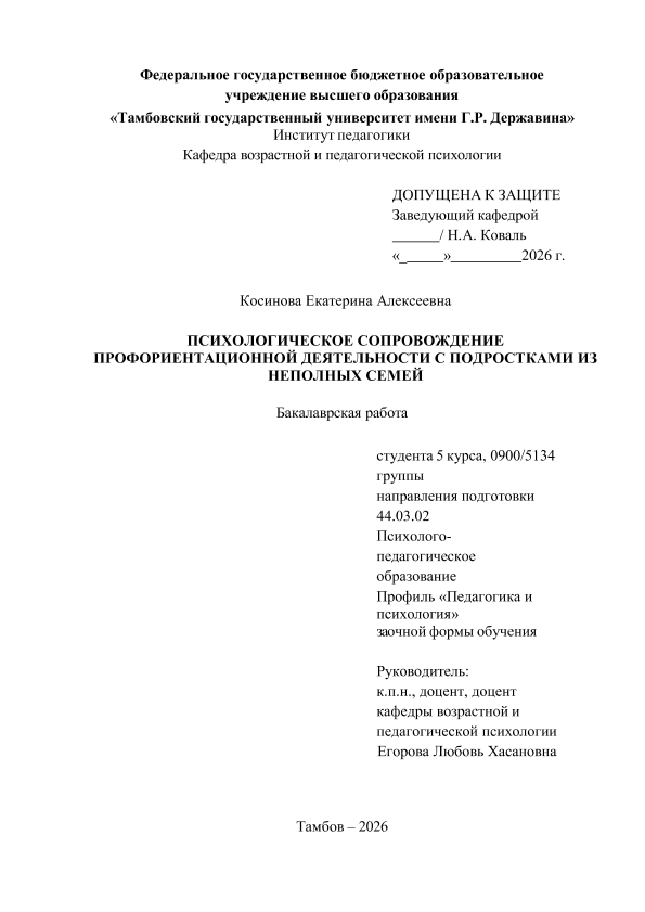 КОСИНОВА, ЕКАТЕРИНА АЛЕКСЕЕВНА. ПСИХОЛОГИЧЕСКОЕ СОПРОВОЖДЕНИЕ ПРОФОРИЕНТАЦИОННОЙ ДЕЯТЕЛЬНОСТИ С ПОДРОСТКАМИ ИЗ НЕПОЛНЫХ СЕМЕЙ [Электронный ресурс]: бакалаврская работа: 44.03.02 Психолого-педагогическое образование: Педагогика и психология: Заочная форма обучения / Е. А. КОСИНОВА; ТГУ им. Г. Р. Державина ; науч. рук. к. пед. н., доцент, Л. Х. Егорова. — Электрон. текстовые дан. (1 файл). — Тамбов, 2026. — Загл. с титул. экрана. — <URL:https://elibrary.tsutmb.ru/dl/docs/vkr18781.pdf>.