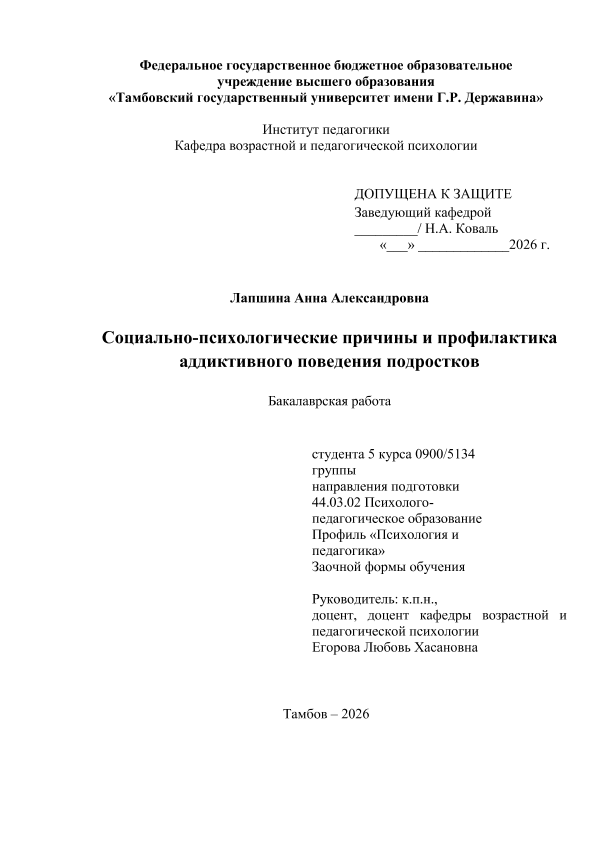 ЛАПШИНА, АННА АЛЕКСАНДРОВНА. СОЦИАЛЬНО-ПСИХОЛОГИЧЕСКИЕ ПРИЧИНЫ И ПРОФИЛАКТИКА АДДИКТИВНОГО ПОВЕДЕНИЯ ПОДРОСТКОВ [Электронный ресурс]: бакалаврская работа: 44.03.02 Психолого-педагогическое образование: Педагогика и психология: Заочная форма обучения / А. А. ЛАПШИНА; ТГУ им. Г. Р. Державина ; науч. рук. к. пед. н., доцент, Л. Х. Егорова. — Электрон. текстовые дан. (1 файл). — Тамбов, 2026. — Загл. с титул. экрана. — <URL:https://elibrary.tsutmb.ru/dl/docs/vkr18783.pdf>.