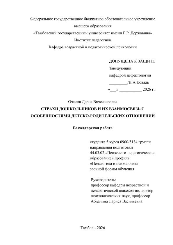 ОЧНЕВА, ДАРЬЯ ВЯЧЕСЛАВОВНА. СТРАХИ ДОШКОЛЬНИКОВ И ИХ ВЗАИМОСВЯЗЬ С ОСОБЕННОСТЯМИ ДЕТСКО-РОДИТЕЛЬСКИХ ОТНОШЕНИЙ [Электронный ресурс]: бакалаврская работа: 44.03.02 Психолого-педагогическое образование: Педагогика и психология: Заочная форма обучения / Д. В. ОЧНЕВА; ТГУ им. Г. Р. Державина ; науч. рук. д. п. н., профессор, Л. В. Абдалина. — Электрон. текстовые дан. (1 файл). — Тамбов, 2026. — Загл. с титул. экрана. — <URL:https://elibrary.tsutmb.ru/dl/docs/vkr18784.pdf>.