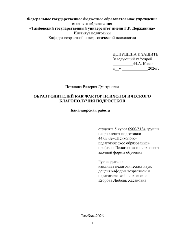 ПОТАПОВА, ВАЛЕРИЯ ДМИТРИЕВНА. ОБРАЗ РОДИТЕЛЕЙ КАК ФАКТОР ПСИХОЛОГИЧЕСКОГО БЛАГОПОЛУЧИЯ ПОДРОСТКОВ [Электронный ресурс]: бакалаврская работа: 44.03.02 Психолого-педагогическое образование: Педагогика и психология: Заочная форма обучения / В. Д. ПОТАПОВА; ТГУ им. Г. Р. Державина ; науч. рук. к. пед. н., доцент, Л. Х. Егорова. — Электрон. текстовые дан. (1 файл). — Тамбов, 2026. — Загл. с титул. экрана. — <URL:https://elibrary.tsutmb.ru/dl/docs/vkr18785.pdf>.
