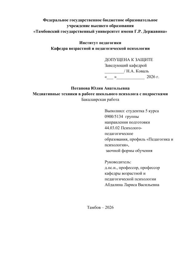 ПОТАПОВА, ЮЛИЯ АНАТОЛЬЕВНА. МЕДИАТИВНЫЕ ТЕХНИКИ В РАБОТЕ ШКОЛЬНОГО ПСИХОЛОГА С ПОДРОСТКАМИ [Электронный ресурс]: бакалаврская работа: 44.03.02 Психолого-педагогическое образование: Педагогика и психология: Заочная форма обучения / Ю. А. ПОТАПОВА; ТГУ им. Г. Р. Державина ; науч. рук. д. п. н., профессор, Л. В. Абдалина. — Электрон. текстовые дан. (1 файл). — Тамбов, 2026. — Загл. с титул. экрана. — <URL:https://elibrary.tsutmb.ru/dl/docs/vkr18786.pdf>.