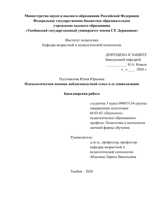 ПУСТОВАЛОВА, ЮЛИЯ ЮРЬЕВНА. ПСИХОЛОГИЧЕСКАЯ ПОМОЩЬ НЕБЛАГОПОЛУЧНОЙ СЕМЬЕ В ЕЕ СОЦИАЛИЗАЦИИ [Электронный ресурс]: бакалаврская работа: 44.03.02 Психолого-педагогическое образование: Педагогика и психология: Заочная форма обучения / Ю. Ю. ПУСТОВАЛОВА; ТГУ им. Г. Р. Державина ; науч. рук. д. п. н., профессор, Л. В. Абдалина. — Электрон. текстовые дан. (1 файл). — Тамбов, 2026. — Загл. с титул. экрана. — <URL:https://elibrary.tsutmb.ru/dl/docs/vkr18787.pdf>.