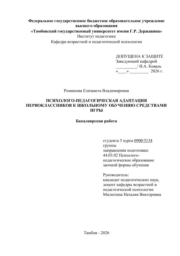 РОМАШОВА, ЕЛИЗАВЕТА ВЛАДИМИРОВНА. ПСИХОЛОГО-ПЕДАГОГИЧЕСКАЯ АДАПТАЦИЯ ПЕРВОКЛАССНИКОВ К ШКОЛЬНОМУ ОБУЧЕНИЮ СРЕДСТВАМИ ИГРЫ [Электронный ресурс]: бакалаврская работа: 44.03.02 Психолого-педагогическое образование: Педагогика и психология: Заочная форма обучения / Е. В. РОМАШОВА; ТГУ им. Г. Р. Державина ; науч. рук. к. пед. н., доцент, Н. В. Милютина. — Электрон. текстовые дан. (1 файл). — Тамбов, 2026. — Загл. с титул. экрана. — <URL:https://elibrary.tsutmb.ru/dl/docs/vkr18789.pdf>.