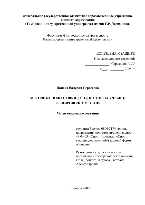ПОПОВА, ВАЛЕРИЯ СЕРГЕЕВНА. МЕТОДИКА ПОДГОТОВКИ ДЗЮДОИСТОВ НА УЧЕБНО- ТРЕНИРОВОЧНОМ ЭТАПЕ [Электронный ресурс]: магистерская диссертация: 49.04.03 Спорт: Спорт высших достижений: Заочная форма обучения / В. С. ПОПОВА; ТГУ им. Г. Р. Державина ; науч. рук. к. пед. н., доцент, С. А. Загузова. — Электрон. текстовые дан. (1 файл). — Тамбов, 2026. — Загл. с титул. экрана. — <URL:https://elibrary.tsutmb.ru/dl/docs/vkr19226.pdf>.