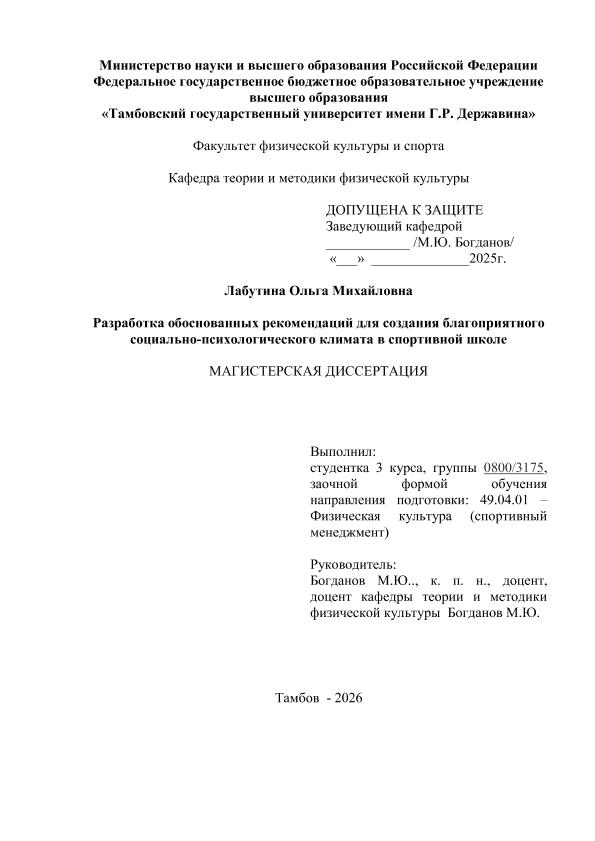 ЛАБУТИНА, ОЛЬГА МИХАЙЛОВНА. РАЗРАБОТКА ОБОСНОВАННЫХ РЕКОМЕНДАЦИЙ ДЛЯ СОЗДАНИЯ БЛАГОПРИЯТНОГО СОЦИАЛЬНО-ПСИХОЛОГИЧЕСКОГО КЛИМАТА В СПОРТИВНОЙ ШКОЛЕ [Электронный ресурс]: магистерская диссертация: 49.04.01 Физическая культура: Спортивный менеджмент: Заочная форма обучения / О. М. ЛАБУТИНА; ТГУ им. Г. Р. Державина ; науч. рук. к. пед. н., доцент, М. Ю. Богданов. — Электрон. текстовые дан. (1 файл). — Тамбов, 2026. — Загл. с титул. экрана. — <URL:https://elibrary.tsutmb.ru/dl/docs/vkr19256.pdf>.