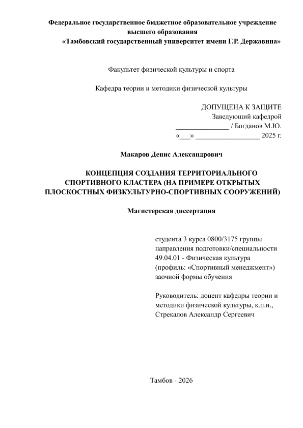 МАКАРОВ, ДЕНИС АЛЕКСАНДРОВИЧ. КОНЦЕПЦИЯ СОЗДАНИЯ ТЕРРИТОРИАЛЬНОГО СПОРТИВНОГО КЛАСТЕРА (НА ПРИМЕРЕ ОТКРЫТЫХ ПЛОСКОСТНЫХ ФИЗКУЛЬТУРНО-СПОРТИВНЫХ СООРУЖЕНИЙ) [Электронный ресурс]: магистерская диссертация: 49.04.01 Физическая культура: Спортивный менеджмент: Заочная форма обучения / Д. А. МАКАРОВ; ТГУ им. Г. Р. Державина ; науч. рук. к. пед. н., доцент, А. С. Стрекалов. — Электрон. текстовые дан. (1 файл). — Тамбов, 2026. — Загл. с титул. экрана. — <URL:https://elibrary.tsutmb.ru/dl/docs/vkr19257.pdf>.