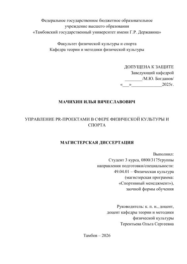 МАЧИХИН, ИЛЬЯ ВЯЧЕСЛАВОВИЧ. УПРАВЛЕНИЕ PR-ПРОЕКТАМИ В СФЕРЕ ФИЗИЧЕСКОЙ КУЛЬТУРЫ И СПОРТА [Электронный ресурс]: магистерская диссертация: 49.04.01 Физическая культура: Спортивный менеджмент: Заочная форма обучения / И. В. МАЧИХИН; ТГУ им. Г. Р. Державина ; науч. рук. к. пед. н., доцент, О. С. Терентьева. — Электрон. текстовые дан. (1 файл). — Тамбов, 2026. — Загл. с титул. экрана. — <URL:https://elibrary.tsutmb.ru/dl/docs/vkr19258.pdf>.