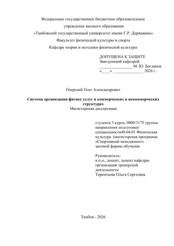 ОЗЕРСКИЙ, ОЛЕГ АЛЕКСАНДРОВИЧ. СИСТЕМА ОРГАНИЗАЦИИ ФИТНЕС УСЛУГ В КОММЕРЧЕСКИХ И НЕ КОММЕРЧЕСКИХ ОРГАНИЗАЦИЯХ НА ПРИМЕРЕ ФИТНЕС АЭРОБИКИ [Электронный ресурс]: магистерская диссертация: 49.04.01 Физическая культура: Спортивный менеджмент: Заочная форма обучения / О. А. ОЗЕРСКИЙ; ТГУ им. Г. Р. Державина ; науч. рук. к. пед. н., доцент, О. С. Терентьева. — Электрон. текстовые дан. (1 файл). — Тамбов, 2026. — Загл. с титул. экрана. — <URL:https://elibrary.tsutmb.ru/dl/docs/vkr19260.pdf>.