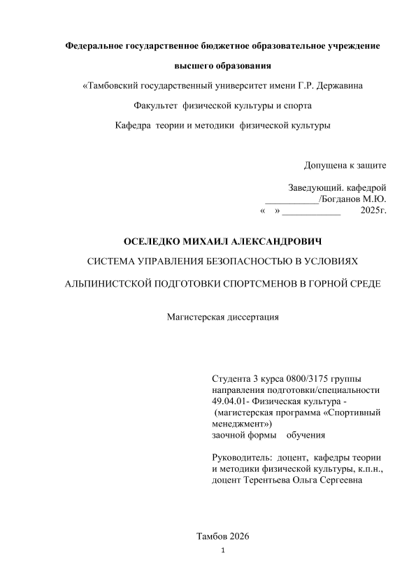 ТЕРЕНТЬЕВА, ОЛЬГА СЕРГЕЕВНА. СИСТЕМА УПРАВЛЕНИЯ БЕЗОПАСНОСТЬЮ В УСЛОВИЯХ АЛЬПИНИСТСКОЙ ПОДГОТОВКИ СПОРТСМЕНОВ В ГОРНОЙ СРЕДЕ [Электронный ресурс]: магистерская диссертация: 49.04.01 Физическая культура: Спортивный менеджмент: Заочная форма обучения / О. С. ТЕРЕНТЬЕВА; ТГУ им. Г. Р. Державина ; науч. рук. к. пед. н., доцент, О. С. ТЕРЕНТЬЕВА. — Электрон. текстовые дан. (1 файл). — Тамбов, 2026. — Загл. с титул. экрана. — <URL:https://elibrary.tsutmb.ru/dl/docs/vkr19261.pdf>.