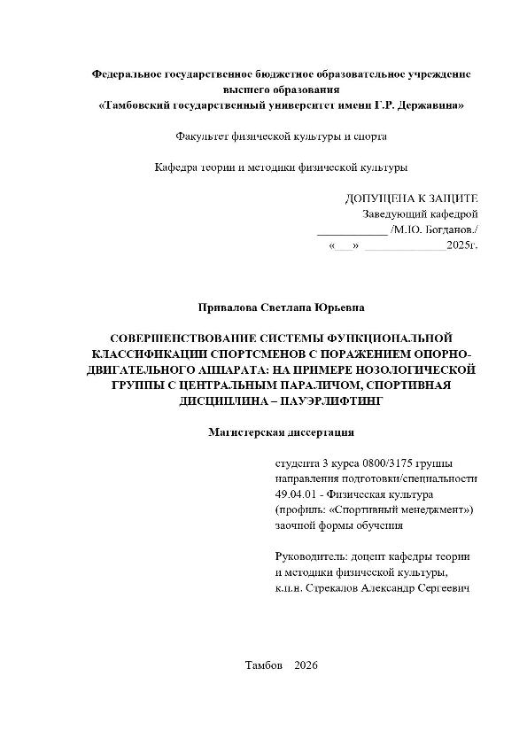 ПРИВАЛОВА, СВЕТЛАНА ЮРЬЕВНА. СОВЕРШЕНСТВОВАНИЕ СИСТЕМЫ ФУНКЦИОНАЛЬНОЙ КЛАССИФИКАЦИИ СПОРТСМЕНОВ С ПОРАЖЕНИЕМ ОПОРНО-ДВИГАТЕЛЬНОГО АППАРАТА: НА ПРИМЕРЕ НОЗОЛОГИЧЕСКОЙ ГРУППЫ С ЦЕНТРАЛЬНЫМ ПАРАЛИЧЕМ, СПОРТИВНАЯ ДИСЦИПЛИНА - ПАУЭРЛИФТИНГ [Электронный ресурс]: магистерская диссертация: 49.04.01 Физическая культура: Спортивный менеджмент: Заочная форма обучения / С. Ю. ПРИВАЛОВА; ТГУ им. Г. Р. Державина ; науч. рук. к. пед. н., доцент, А. С. СТРЕКАЛОВ. — Электрон. текстовые дан. (1 файл). — Тамбов, 2026. — Загл. с титул. экрана. — <URL:https://elibrary.tsutmb.ru/dl/docs/vkr19262.pdf>.