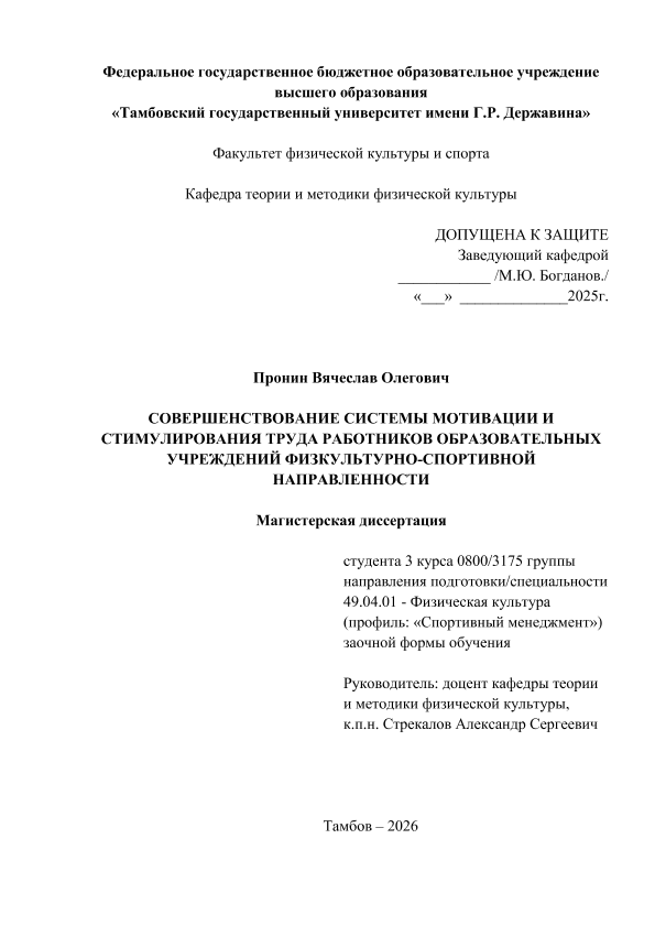 ПРОНИН, ВЯЧЕСЛАВ ОЛЕГОВИЧ. СОВЕРШЕНСТВОВАНИЕ СИСТЕМЫ МОТИВАЦИИ И СТИМУЛИРОВАНИЯ ТРУДА РАБОТНИКОВ ОБРАЗОВАТЕЛЬНЫХ УЧРЕЖДЕНИЙ ФИЗКУЛЬТУРНО-СПОРТИВНОЙ НАПРАВЛЕННОСТИ [Электронный ресурс]: магистерская диссертация: 49.04.01 Физическая культура: Спортивный менеджмент: Заочная форма обучения / В. О. ПРОНИН; ТГУ им. Г. Р. Державина ; науч. рук. к. пед. н., доцент, А. С. Стрекалов. — Электрон. текстовые дан. (1 файл). — Тамбов, 2026. — Загл. с титул. экрана. — <URL:https://elibrary.tsutmb.ru/dl/docs/vkr19263.pdf>.