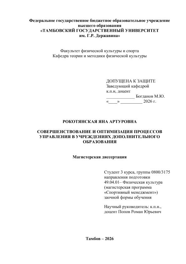 РОКОТЯНСКАЯ, ЯНА АРТУРОВНА. СОВЕРШЕНСТВОВАНИЕ И ОПТИМИЗАЦИЯ ПРОЦЕССОВ УПРАВЛЕНИЯ В УЧРЕЖДЕНИЯХ ДОПОЛНИТЕЛЬНОГО ОБРАЗОВАНИЯ [Электронный ресурс]: магистерская диссертация: 49.04.01 Физическая культура: Спортивный менеджмент: Заочная форма обучения / Я. А. РОКОТЯНСКАЯ; ТГУ им. Г. Р. Державина ; науч. рук. к. пед. н., доцент, Р. Ю. Попов. — Электрон. текстовые дан. (1 файл). — Тамбов, 2026. — Загл. с титул. экрана. — <URL:https://elibrary.tsutmb.ru/dl/docs/vkr19264.pdf>.