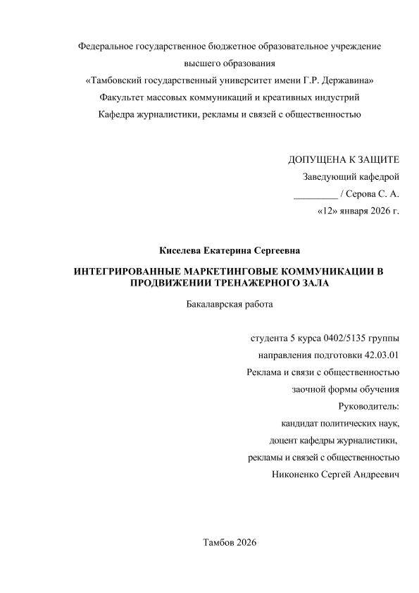 КИСЕЛЕВА, ЕКАТЕРИНА СЕРГЕЕВНА. ИНТЕГРИРОВАННЫЕ МАРКЕТИНГОВЫЕ КОММУНИКАЦИИ В ПРОДВИЖЕНИИ ТРЕНАЖЕРНОГО ЗАЛА [Электронный ресурс]: бакалаврская работа: 42.03.01 Реклама и связи с общественностью: Заочная форма обучения / Е. С. КИСЕЛЕВА; ТГУ им. Г. Р. Державина ; науч. рук. к. полит. н., доцент, С. А. Никоненко. — Электрон. текстовые дан. (1 файл). — Тамбов, 2026. — Загл. с титул. экрана. — <URL:https://elibrary.tsutmb.ru/dl/docs/vkr18882.pdf>.