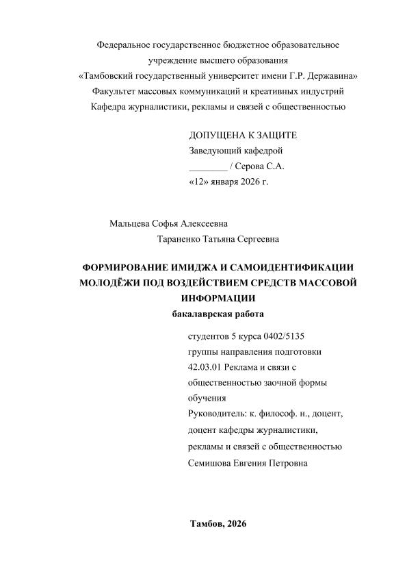 МАЛЬЦЕВА, СОФЬЯ АЛЕКСЕЕВНА. ФОРМИРОВАНИЕ ИМИДЖА И САМОИДЕНТИФИКАЦИИ МОЛОДЕЖИ ПОД ВОЗДЕЙСТВИЕМ СРЕДСТВ МАССОВОЙ ИНФОРМАЦИИ [Электронный ресурс]: бакалаврская работа: 42.03.01 Реклама и связи с общественностью: Заочная форма обучения / С. А. МАЛЬЦЕВА; ТГУ им. Г. Р. Державина ; науч. рук. к. филос. н., доцент, Е. П. Семишова. — Электрон. текстовые дан. (1 файл). — Тамбов, 2026. — Загл. с титул. экрана. — <URL:https://elibrary.tsutmb.ru/dl/docs/vkr18883.pdf>.