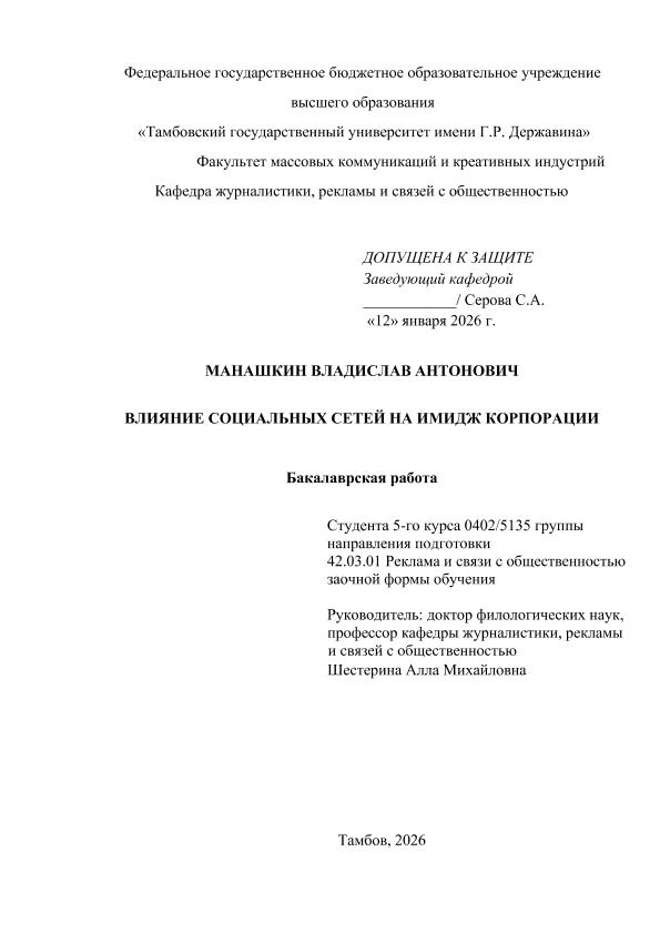 МАНАШКИН, ВЛАДИСЛАВ АНТОНОВИЧ. ВЛИЯНИЕ СОЦИАЛЬНЫХ СЕТЕЙ НА ИМИДЖ КОРПОРАЦИИ [Электронный ресурс]: бакалаврская работа: 42.03.01 Реклама и связи с общественностью: Заочная форма обучения / В. А. МАНАШКИН; ТГУ им. Г. Р. Державина ; науч. рук. д. ф. н., профессор, А. М. Шестерина. — Электрон. текстовые дан. (1 файл). — Тамбов, 2026. — Загл. с титул. экрана. — <URL:https://elibrary.tsutmb.ru/dl/docs/vkr18884.pdf>.
