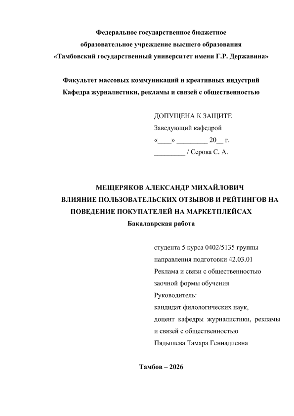 МЕЩЕРЯКОВ, АЛЕКСАНДР МИХАЙЛОВИЧ. ВЛИЯНИЕ ПОЛЬЗОВАТЕЛЬСКИХ ОТЗЫВОВ И РЕЙТИНГОВ НА ПОВЕДЕНИЕ ПОКУПАТЕЛЕЙ НА МАРКЕТПЛЕЙСАХ [Электронный ресурс]: бакалаврская работа: 42.03.01 Реклама и связи с общественностью: Заочная форма обучения / А. М. МЕЩЕРЯКОВ; ТГУ им. Г. Р. Державина ; науч. рук. к. э. н., доцент, Т. Г. Пядышева. — Электрон. текстовые дан. (1 файл). — Тамбов, 2026. — Загл. с титул. экрана. — <URL:https://elibrary.tsutmb.ru/dl/docs/vkr18885.pdf>.