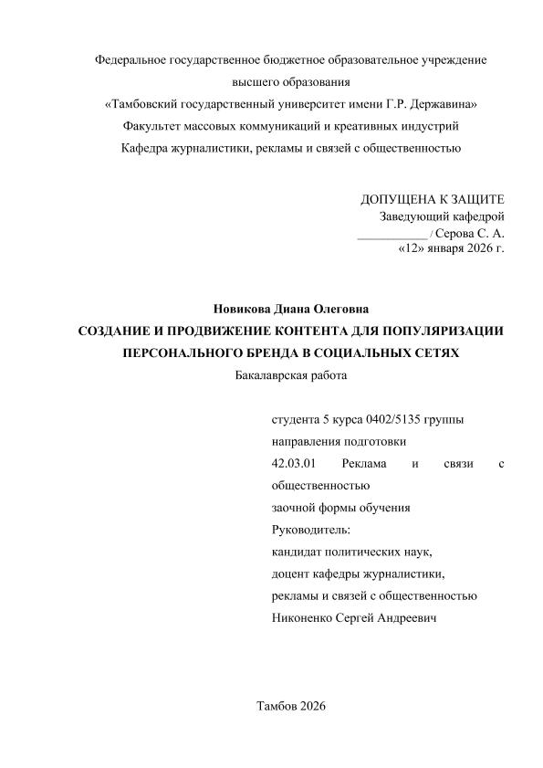 НОВИКОВА, ДИАНА ОЛЕГОВНА. СОЗДАНИЕ И ПРОДВИЖЕНИЕ КОНТЕНТА ДЛЯ ПОПУЛЯРИЗАЦИИ ПЕРСОНАЛЬНОГО БРЕНДА В СОЦИАЛЬНЫХ СЕТЯХ [Электронный ресурс]: бакалаврская работа: 42.03.01 Реклама и связи с общественностью: Заочная форма обучения / Д. О. НОВИКОВА; ТГУ им. Г. Р. Державина ; науч. рук. к. полит. н., доцент, С. А. Никоненко. — Электрон. текстовые дан. (1 файл). — Тамбов, 2026. — Загл. с титул. экрана. — <URL:https://elibrary.tsutmb.ru/dl/docs/vkr18888.pdf>.