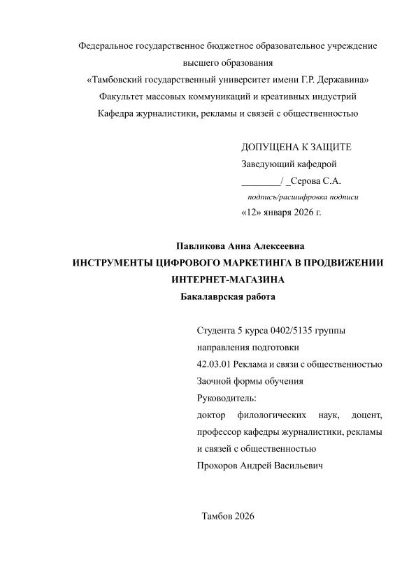ПАВЛИКОВА, АННА АЛЕКСЕЕВНА. ИНСТРУМЕНТЫ ЦИФРОВОГО МАРКЕТИНГА В ПРОДВИЖЕНИИ ИНТЕРНЕТ-МАГАЗИНА [Электронный ресурс]: бакалаврская работа: 42.03.01 Реклама и связи с общественностью: Заочная форма обучения / А. А. ПАВЛИКОВА; ТГУ им. Г. Р. Державина ; науч. рук. к. ф. н., доцент, А. В. Прохоров. — Электрон. текстовые дан. (1 файл). — Тамбов, 2026. — Загл. с титул. экрана. — <URL:https://elibrary.tsutmb.ru/dl/docs/vkr18889.pdf>.