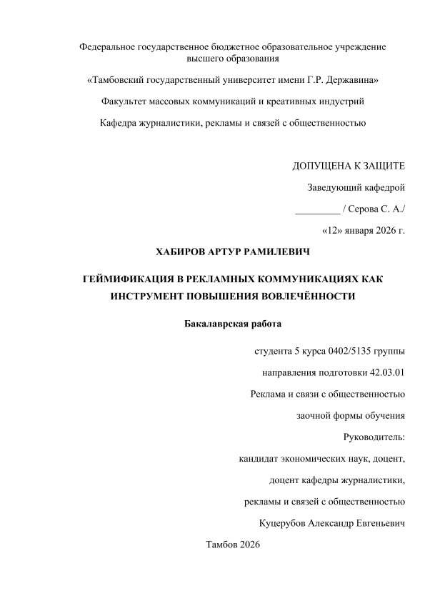 ХАБИРОВ, АРТУР РАМИЛЕВИЧ. ГЕЙМИФИКАЦИЯ В РЕКЛАМНЫХ КОММУНИКАЦИЯХ КАК ИНСТРУМЕНТ ПОВЫШЕНИЯ ВОВЛЕЧЕННОСТИ [Электронный ресурс]: бакалаврская работа: 42.03.01 Реклама и связи с общественностью: Заочная форма обучения / А. Р. ХАБИРОВ; ТГУ им. Г. Р. Державина ; науч. рук. к. э. н., доцент, А. Е. Куцерубов. — Электрон. текстовые дан. (1 файл). — Тамбов, 2026. — Загл. с титул. экрана. — <URL:https://elibrary.tsutmb.ru/dl/docs/vkr18891.pdf>.